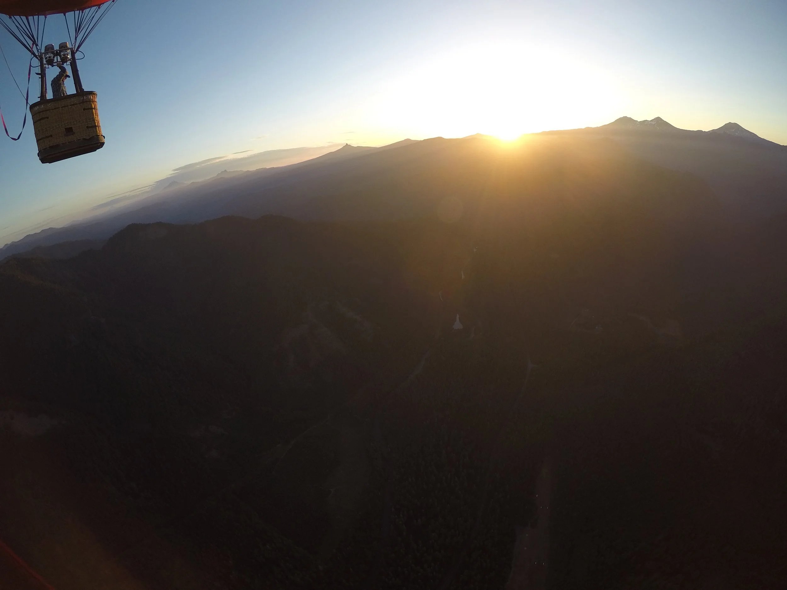 The total time for this trip will be approximately 24hrs. We will meet at a specified time (around mid-day) and location in Redmond OR. From there we will provide shuttle service to our launch location in McKenzie Bridge, about two hour drive away. You will be provided with lodging and dinner that evening prior to our flight. The next morning, we will be up before dawn to get ready for our flight over the mountains. After a quick shuttle to the launch site you can take part in the inflation of the balloon as we make final preparations for lift off. When the balloon is ready you’ll climb into the gondola and we’ll be airborne, making a rapid ascent to around 10,000 ft above sea level. Our cruising altitude will be anywhere between 10,000 to 14,000 ft depending on wind currents. The time and distance of our voyage will vary depending on wind speeds and direction, but on average will be about 2 - 2.5 hours in duration and will cover 40 – 70 miles. Our flight path will take us over the Central Cascade Range with views of every mountain peak from southern Oregon to southern Washington. Behind us to the west you’ll view the ranges and foothills leading to the green fields of the Willamette Valley and as we’re heading east, the broad expanse of the Central Oregon High Desert.